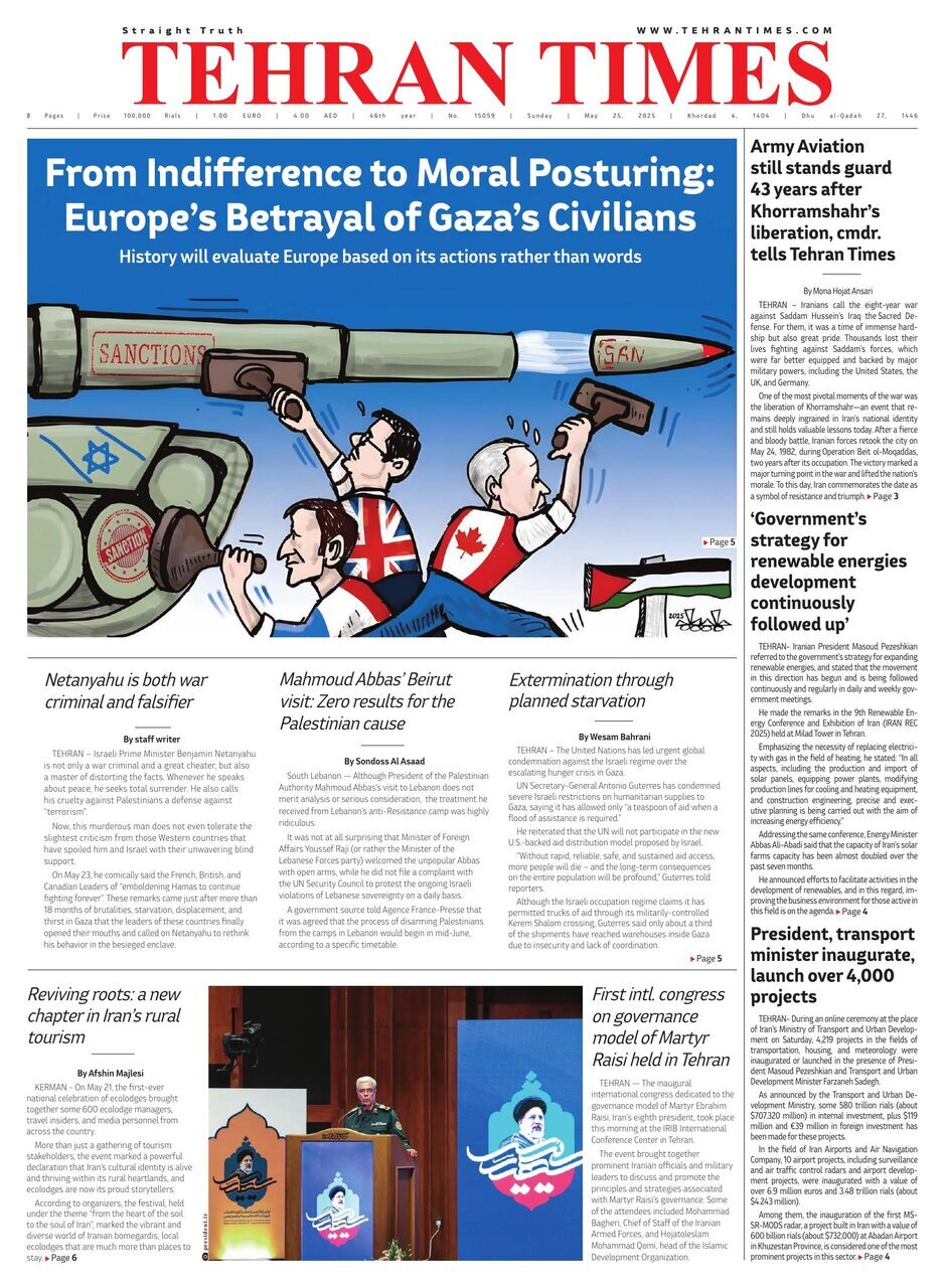 Politics 25 May 2025 - 06:54 Download photos Front pages of Iran’s English dailies on May 25 TEHRAN, May 25 (MNA) – Here are the front pages of Iran’s English language dailies on Sunday, May 25. Tags Iran Iran International Dailies Iranian Newspapers Related News Front pages of Iran’s English dailies on May 24 Front pages of Iran’s English dailies on May 26 Front pages of Iran’s English dailies on May 22 Front pages of Iran’s English dailies on May 27 Front pages of Iran’s English dailies on May 21