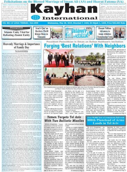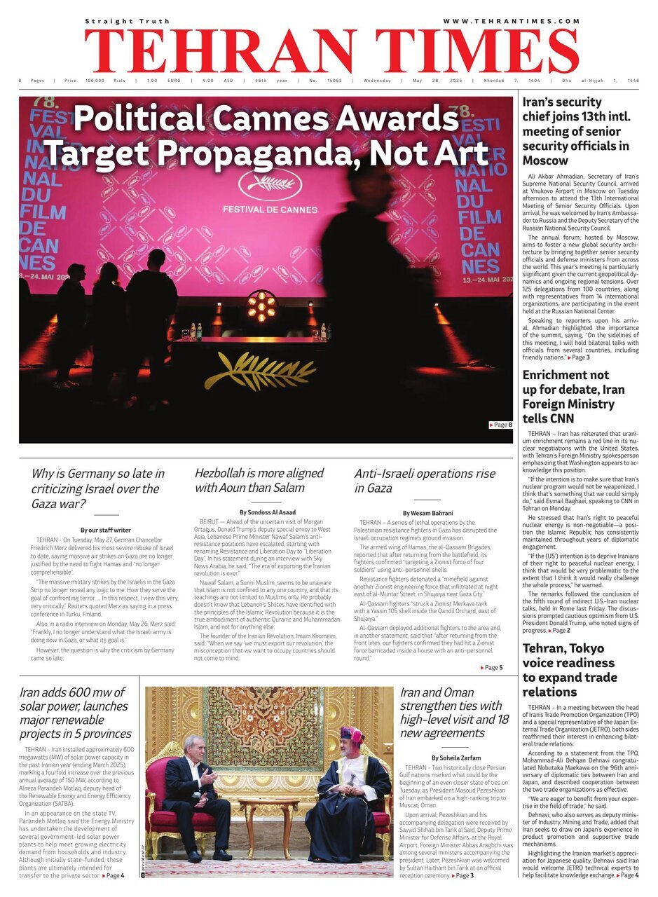 Politics 28 May 2025 - 06:36 Download photos Front pages of Iran’s English dailies on May 28 TEHRAN, May 28 (MNA) – Here are the front pages of Iran’s English language dailies on Wednesday, May 28. Tags Iran Iran International Dailies Iranian Newspapers Related News Front pages of Iran’s English dailies on May 27 Front pages of Iran’s English dailies on May 26 Front pages of Iran’s English dailies on May 31 Front pages of Iran's English dailies on June 1