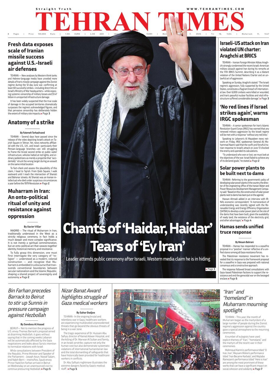 Politics 7 July 2025 - 06:40 Download photos Front pages of Iran's English dailies on July 7 TEHRAN, Jul. 07 (MNA) – Here are the front pages of Iran's English language dailies on Monday, July 7. Tags Iran Iran International Dailies Iranian Newspapers Related News Front pages of Iran's English dailies on July 3 Front pages of Iran's English dailies on July 8 Front pages of Iran's English dailies on July 2 Front pages of Iran's English dailies on July 9 Front pages of Iran's English dailies on July 1 Front pages of Iran's English dailies on July 12