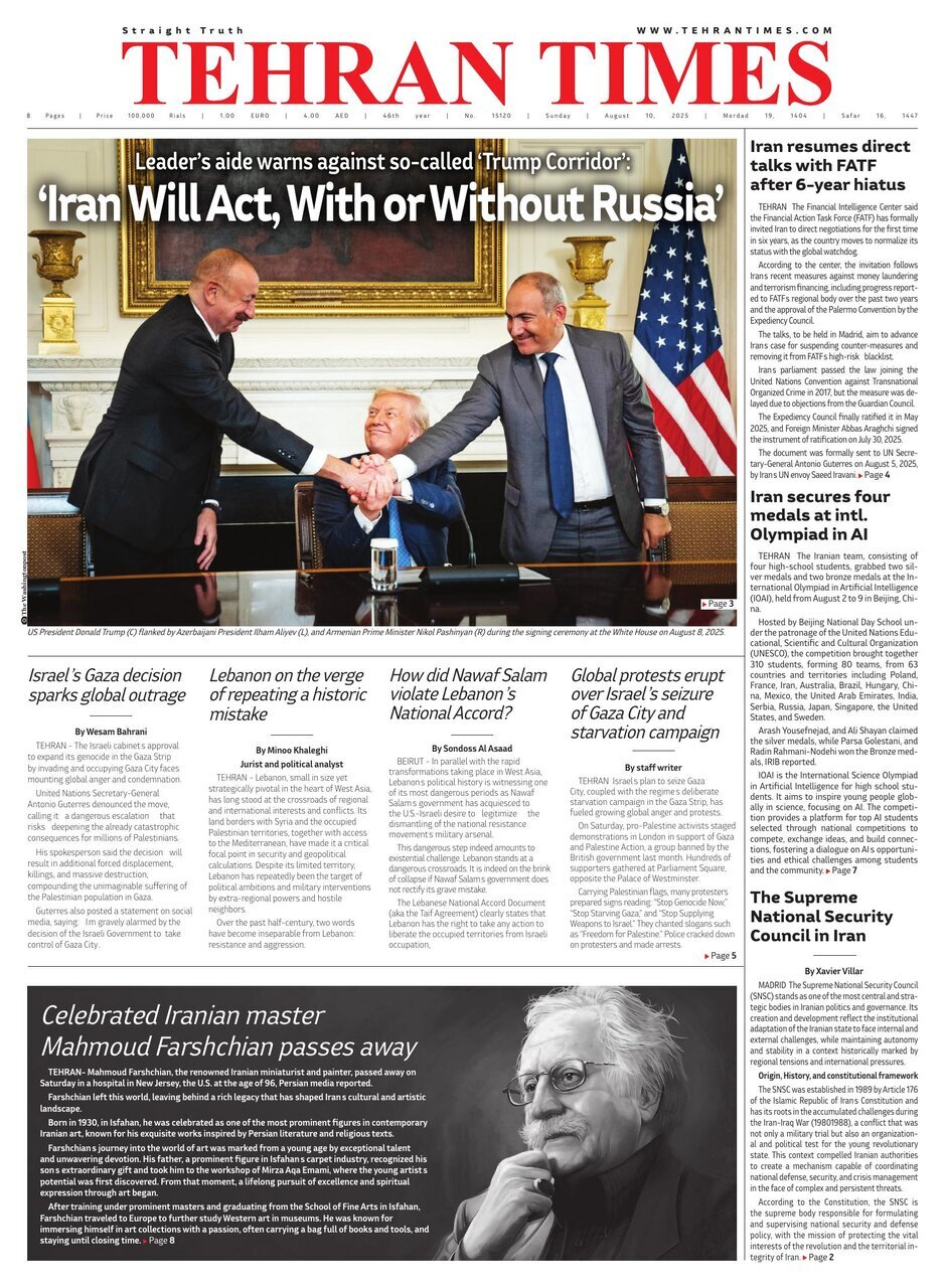 Politics 10 August 2025 - 06:44 Download photos Front pages of Iran’s English dailies on August 10 TEHRAN, Aug. 10 (MNA) – Here are the front pages of Iran’s English language dailies on Sunday, August 10. Tags Iran Iran International Dailies Iranian Newspapers Related News Front pages of Iran’s English dailies on August 9 Front pages of Iran’s English dailies on August 11 Front pages of Iran’s English dailies on August 6 Front pages of Iran’s English dailies on August 12 Front pages of Iran’s English dailies on August 13