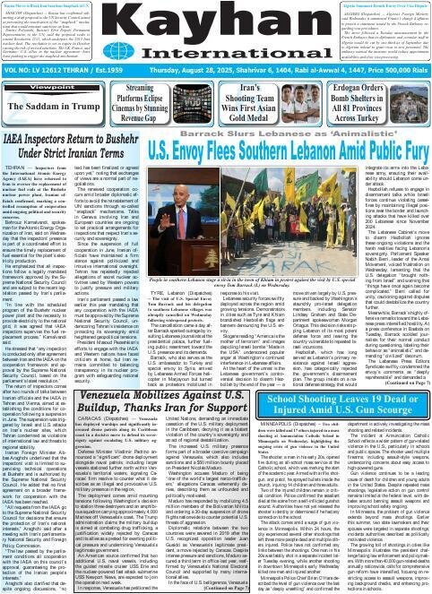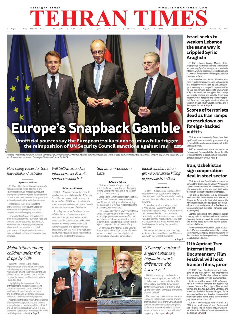 Politics Morteza Ahmadi Al Hashem 28 August 2025 - 10:41 Download photos Front pages of Iran’s English dailies on August 28 TEHRAN, Aug. 28 (MNA) – Here are the front pages of Iran’s English language dailies on Thursday, August 28. Tags Iran International Dailies Iranian Newspapers English newspapers Tehran Times News Daily Tehran Times Related News Front pages of Iran’s English dailies on August 27 Front pages of Iran’s English dailies on August 30 Front pages of Iran’s English dailies on August 26 Front pages of Iran’s English dailies on August 31 Front pages of Iran’s English dailies on August 25 Front pages of Iran’s English dailies on August 21