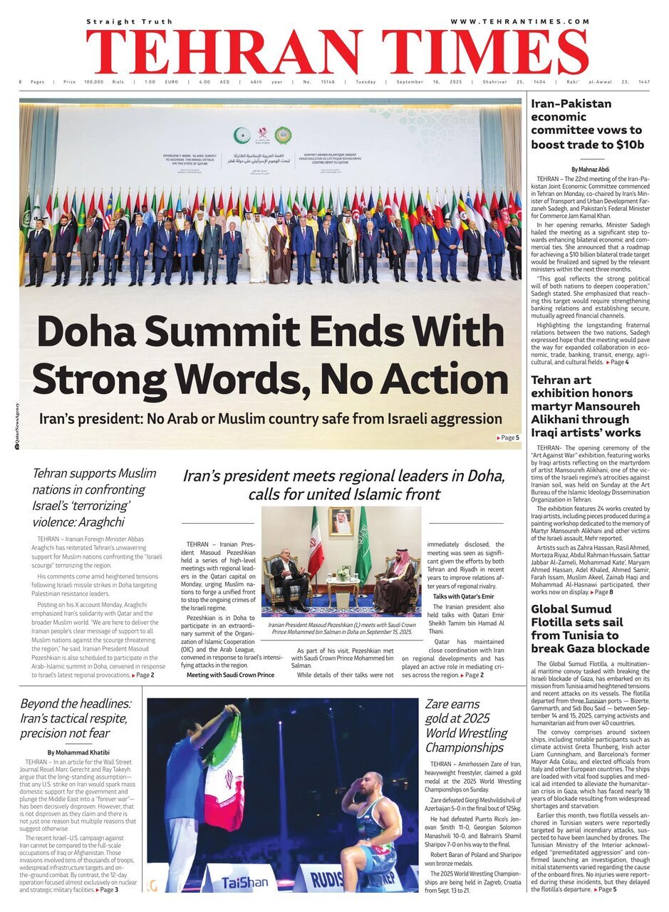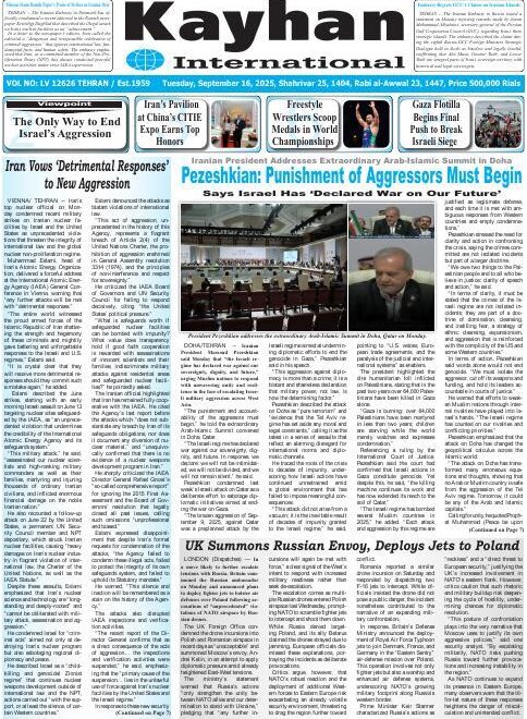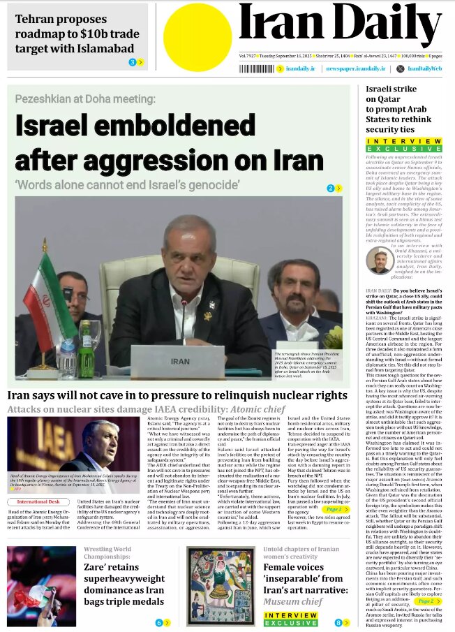 Politics 16 September 2025 - 06:31 Download photos Front pages of Iran's English dailies on September 16 TEHRAN, Sep. 16 (MNA) – Here are the front pages of Iran's English language dailies on Tuesday, September 16. Tags Iran Iran International Dailies Iranian Newspapers Related News Front pages of Iran's English dailies on September 15 Front pages of Iran's English dailies on September 17 Front pages of Iran's English dailies on September 14 Front pages of Iran's English dailies on September 18 Front pages of Iran's English dailies on September 13