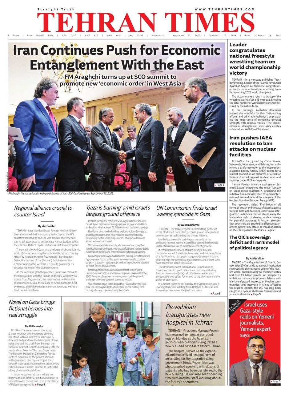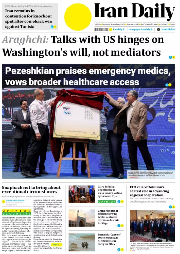 Politics 17 September 2025 - 06:37 Download photos Front pages of Iran's English dailies on September 17 TEHRAN, Sep. 17 (MNA) – Here are the front pages of Iran's English language dailies on Wednesday, September 17. Tags Iran Iran International Dailies Iranian Newspapers Related News Front pages of Iran's English dailies on September 16 Front pages of Iran's English dailies on September 18 Front pages of Iran's English dailies on September 15 Front pages of Iran's English dailies on September 20 Front pages of Iran's English dailies on September 21