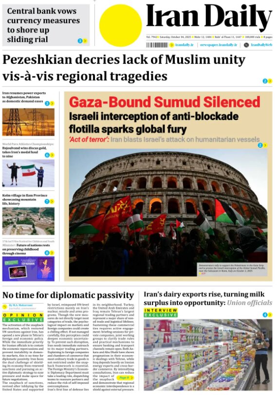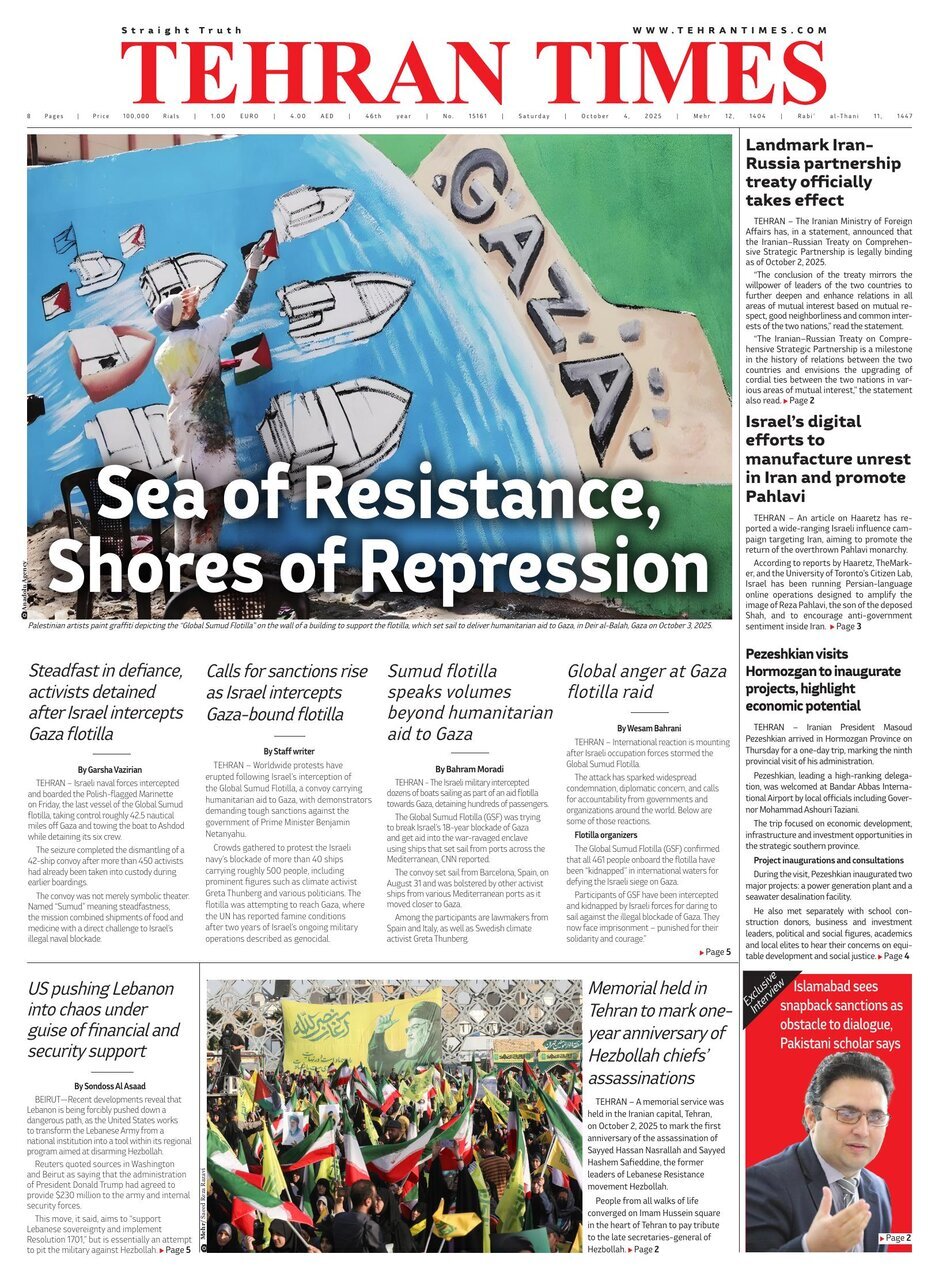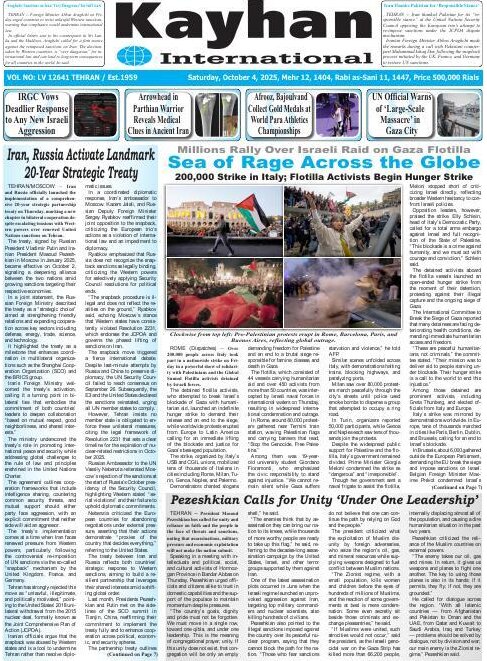 Politics 4 October 2025 - 06:44 Download photos Front pages of Iran’s English dailies on October 4 TEHRAN, Oct. 4 (MNA) – Here are the front pages of Iran’s English language dailies on Saturday, October 04. Tags Iran Iran International Dailies Iranian Newspapers Related News Front pages of Iran’s English dailies on October 2 Front pages of Iran’s English dailies on October 5 Front pages of Iran’s English dailies on October 1 Front pages of Iran’s English dailies on October 6 Front pages of Iran's English dailies on September 30 Front pages of Iran’s English dailies on October 7 Front pages of Iran's English dailies on September 29