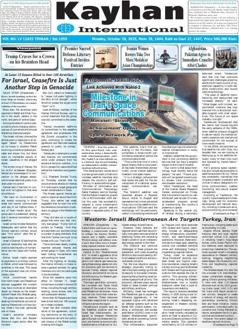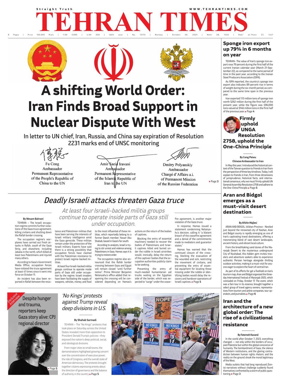 Iran Iran Marzieh Rahmani 20 October 2025 - 08:49 Download photos Front pages of Iran’s English dailies on October 20 TEHRAN, Oct. 20 (MNA) – Here are the front pages of Iran’s English language dailies on Monday, October 20. Tags Iranian Dailies Iran International Dailies Iran Related News Front pages of Iran’s English dailies on October 21 Front pages of Iran’s English dailies on October 22