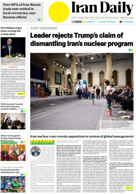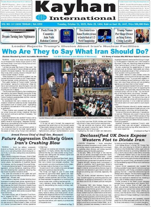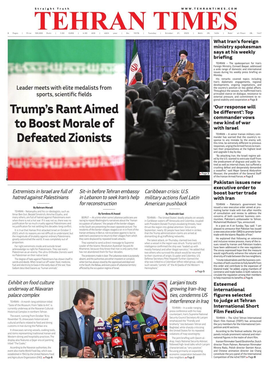 Politics 21 October 2025 - 06:19 Download photos Front pages of Iran’s English dailies on October 21 TEHRAN, Oct. 21 (MNA) – Here are the front pages of Iran’s English language dailies on Tuesday, October 21. Tags Iran Iran International Dailies Iranian Newspapers Related News Front pages of Iran’s English dailies on October 20 Front pages of Iran’s English dailies on October 22 Front pages of Iran’s English dailies on October 19 Front pages of Iran’s English dailies on October 23 Front pages of Iran’s English dailies on October 18