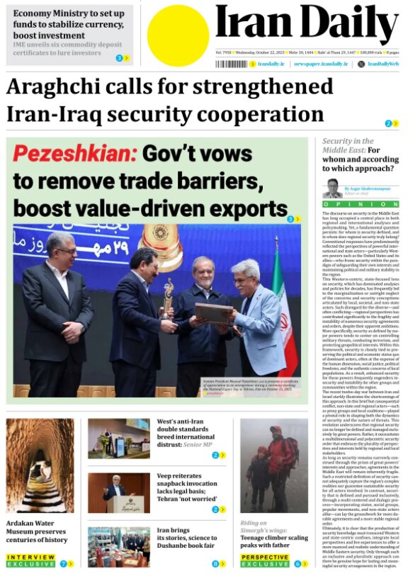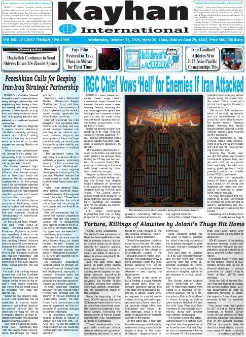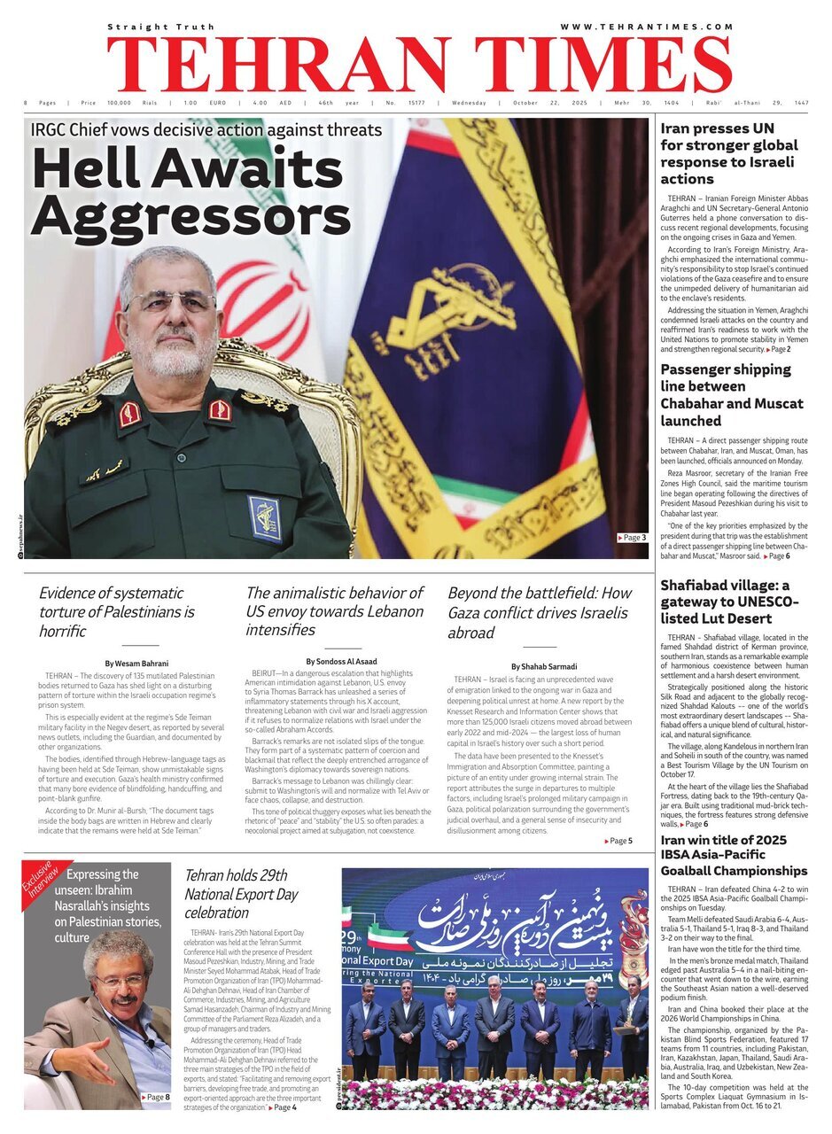 Politics 22 October 2025 - 06:33 Download photos Front pages of Iran’s English dailies on October 22 TEHRAN, Oct. 22 (MNA) – Here are the front pages of Iran’s English language dailies on Wednesday, October 22. Tags Iran Iran International Dailies Iranian Newspapers Related News Front pages of Iran’s English dailies on October 21 Front pages of Iran’s English dailies on October 23 Front pages of Iran’s English dailies on October 20 Front pages of Iran’s English dailies on October 25 Front pages of Iran’s English dailies on October 26