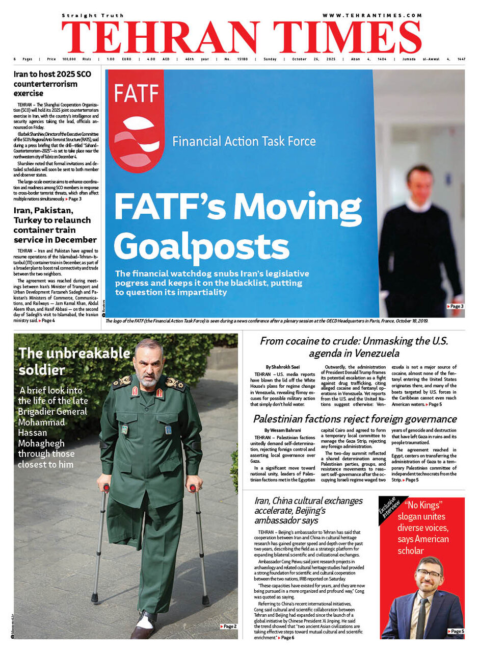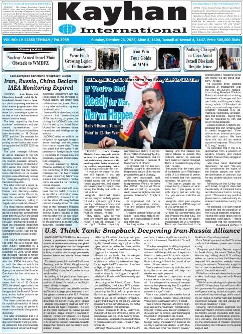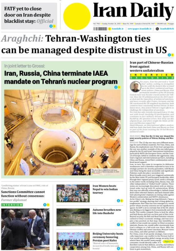 Politics 26 October 2025 - 06:52 Download photos Front pages of Iran’s English dailies on October 26 TEHRAN, Oct. 26 (MNA) – Here are the front pages of Iran’s English language dailies on Sunday, October 26. Tags Iran Iran International Dailies Iranian Newspapers Related News Front pages of Iran’s English dailies on October 25 Front pages of Iran’s English dailies on October 23 Front pages of Iran’s English dailies on October 22 Front pages of Iran’s English dailies on October 29