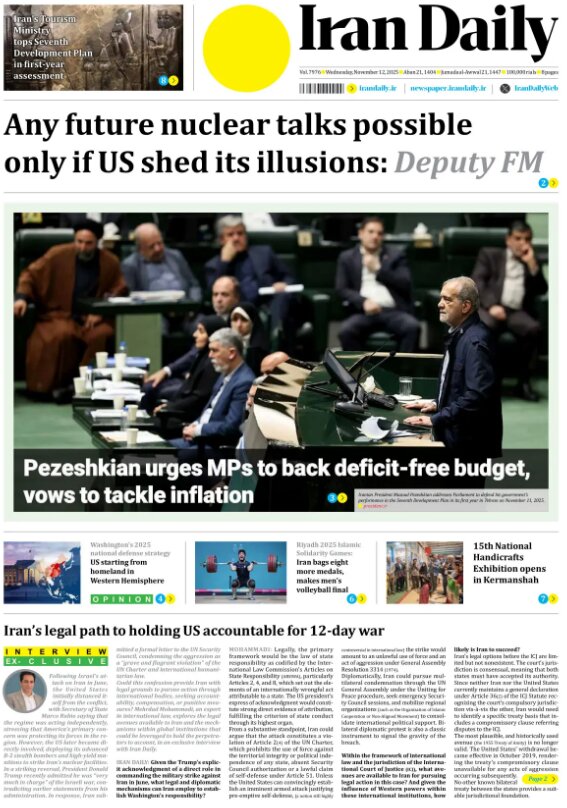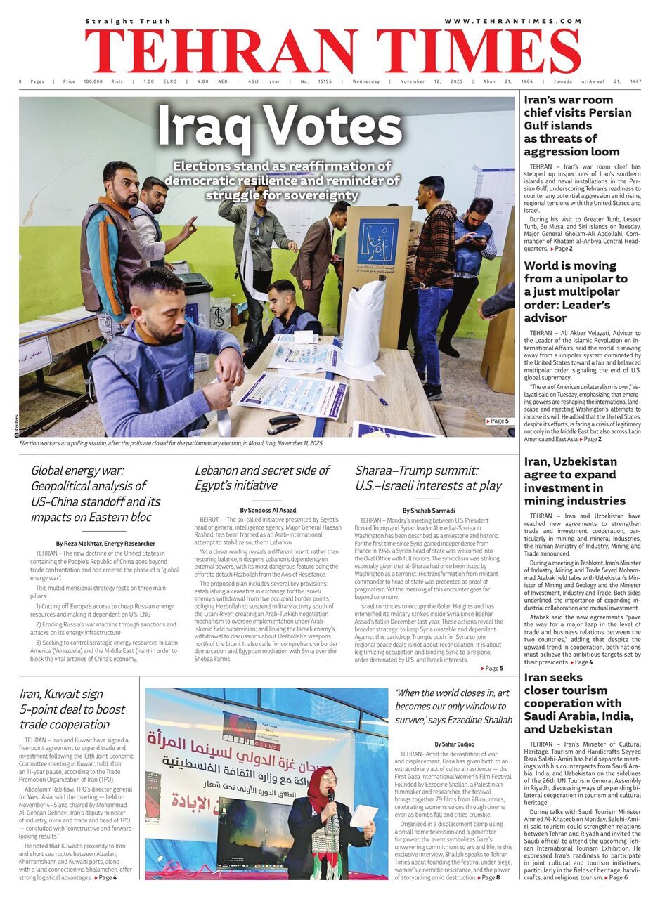 Politics 12 November 2025 - 06:50 Download photos Front pages of Iran's English dailies on November 12 TEHRAN, Nov. 12 (MNA) – Here are the front pages of Iran's English language dailies on Wednesday, November 12. Tags Iran Iran International Dailies Iranian Newspapers Related News Front pages of Iran's English dailies on November 11 Front pages of Iran's English dailies on November 10 Front pages of Iran's English dailies on November 15 Front pages of Iran's English dailies on November 16