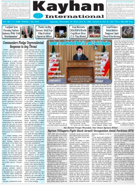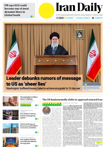 Politics 29 November 2025 - 07:00 Download photos Front pages of Iran’s English dailies on November 29 TEHRAN, Nov. 29 (MNA) – Here are the front pages of Iran's English language dailies on Saturday, November 29. Tags Iran Iran International Dailies Iranian Newspapers Related News Front pages of Iran’s English dailies on November 26 Front pages of Iran’s English dailies on November 30 Front pages of Iran’s English dailies on November 25 Front pages of Iran's English dailies on December 1 Front pages of Iran's English dailies on December 2