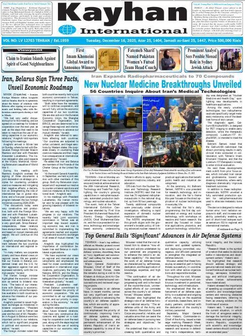 Politics 16 December 2025 - 06:57 Download photos Front pages of Iran's English dailies on December 16 TEHRAN, Dec. 16 (MNA) – Here are the front pages of Iran's English language dailies on Tuesday, December 16. Tags Iran Iran International Dailies Iranian Newspapers Related News Front pages of Iran's English dailies on December 15 Front pages of Iran's English dailies on December 17 Front pages of Iran's English dailies on December 14 Front pages of Iran’s English dailies on December 18 Front pages of Iran's English dailies on December 13 Front pages of Iran’s English dailies on December 20