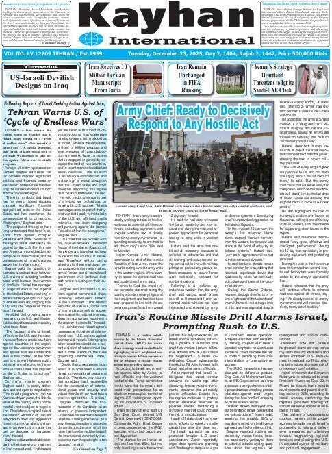 Politics 23 December 2025 - 06:53 Download photos Front pages of Iran’s English dailies on December 23 TEHRAN, Dec. 23 (MNA) – Here are the front pages of Iran's English language dailies on Tuesday, December 23. Tags Iran Iran International Dailies Iranian Newspapers Related News Front pages of Iran’s English dailies on December 22 Front pages of Iran’s English dailies on December 24 Front pages of Iran’s English dailies on December 21 Front pages of Iran’s English dailies on December 25 Front pages of Iran’s English dailies on December 20 Front pages of Iran’s English dailies on December 28