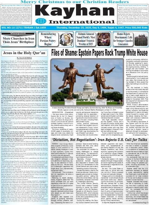 Politics Morteza Ahmadi Al Hashem 25 December 2025 - 11:56 Download photos Front pages of Iran’s English dailies on December 25 TEHRAN, Dec. 25 (MNA) – Here are the front pages of Iran's English language dailies on Thursday, December 25. Tags Iran International Dailies Tehran Times News Daily English newspapers Related News Front pages of Iran’s English dailies on December 24 Front pages of Iran’s English dailies on December 28 Front pages of Iran’s English dailies on December 23 Front pages of Iran’s English dailies on December 29 Front pages of Iran’s English dailies on December 22 Front pages of Iran’s English dailies on December 30 Front pages of Iran’s English dailies on December 21