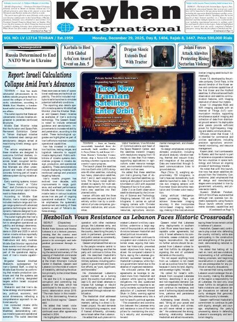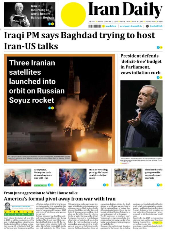 Politics 29 December 2025 - 07:08 Download photos Front pages of Iran’s English dailies on December 29 TEHRAN, Dec. 29 (MNA) – Here are the front pages of Iran's English language dailies on Monday, December 29. Tags Iran Iran International Dailies Iranian Newspapers Related News Front pages of Iran’s English dailies on December 28 Front pages of Iran’s English dailies on December 30 Front pages of Iran’s English dailies on December 25 Front pages of Iran’s English dailies on December 31 Front pages of Iran’s English dailies on December 24 Front pages of Iran's English dailies on January 1