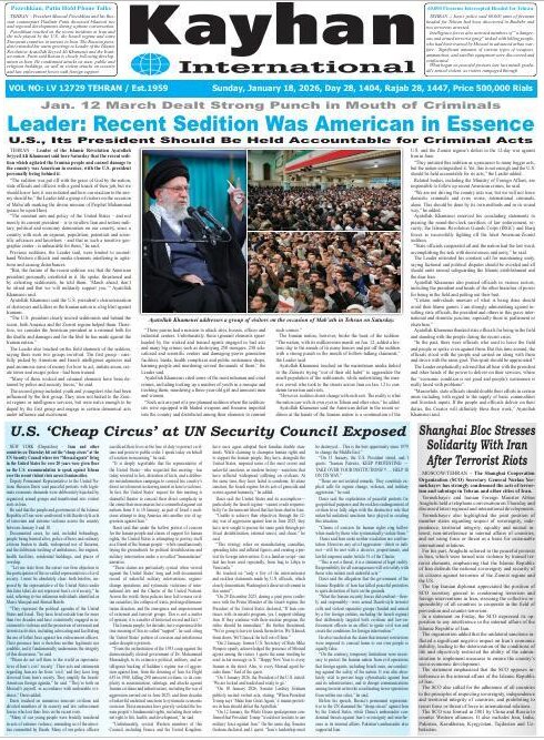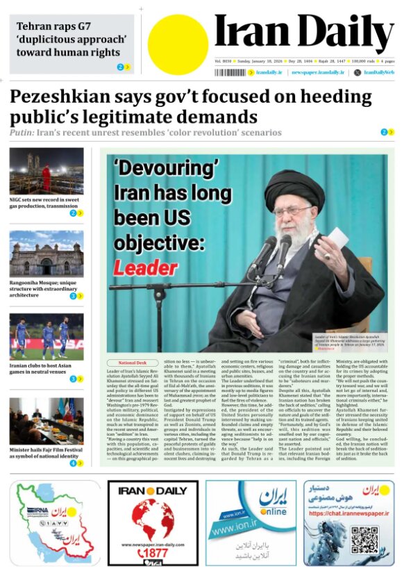 Politics 18 January 2026 - 06:43 Download photos Front pages of Iran's English dailies on January 18 TEHRAN, Jan. 18 (MNA) – Here are the front pages of Iran's English language dailies on Sunday, January 18. Tags Iran Iran International Dailies Iranian Newspapers Iran developments Iran news Related News Front pagers of Iran’s English dailies on January 21 Front pages of Iran’s English dailies on January 22