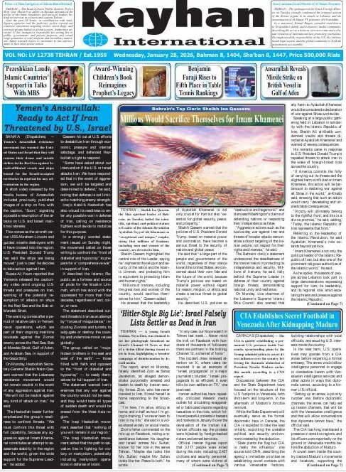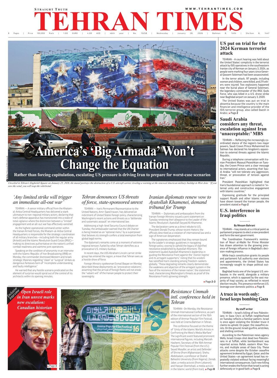 Politics 28 January 2026 - 07:18 Download photos Front pages of Iran’s English dailies on January 28 TEHRAN, Jan. 28 (MNA) – Here are the front pages of Iran's English language dailies on Wednesday, January 28. Tags Iran Iran International Dailies Iranian Newspapers