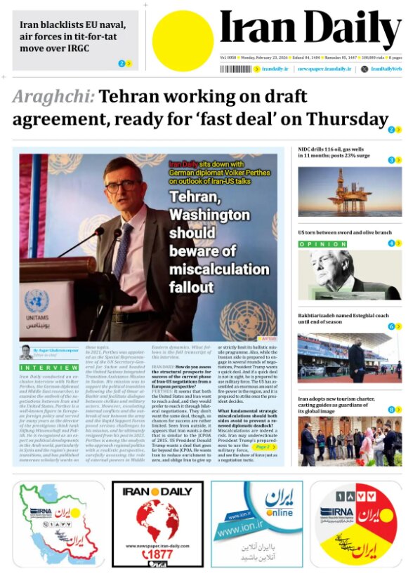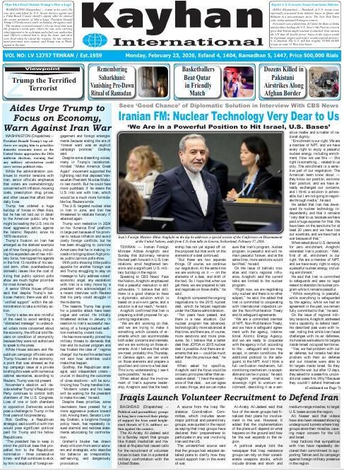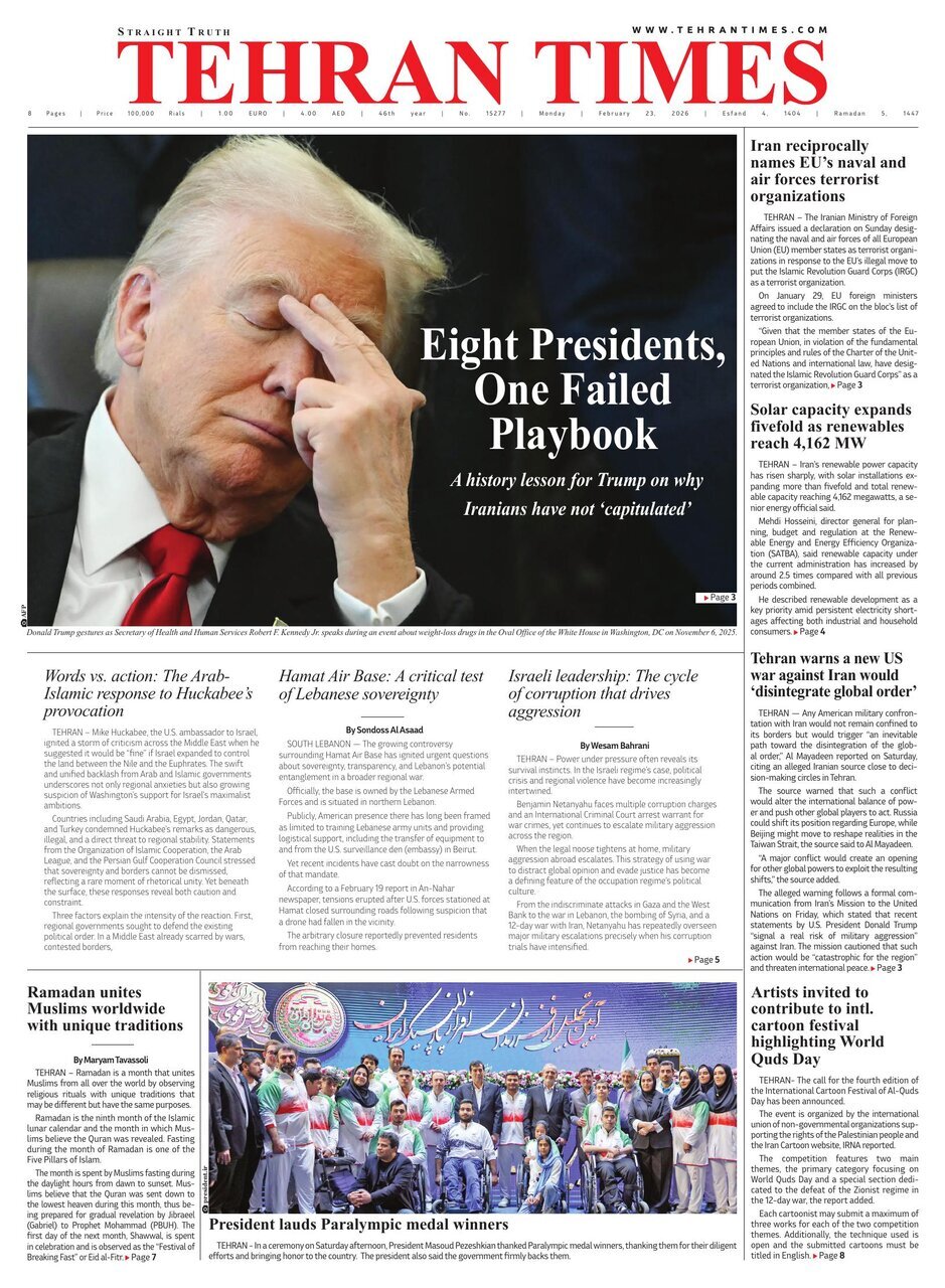 TEHRAN, Feb. 23 (MNA) – Here are the front pages of Iran's English language dailies on Monday, February 23.