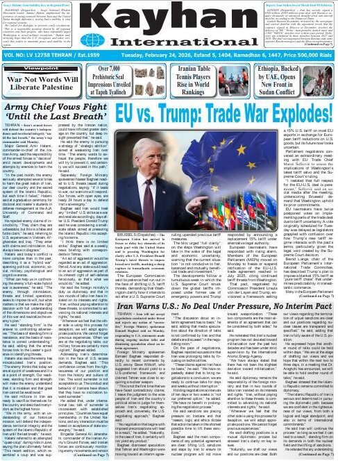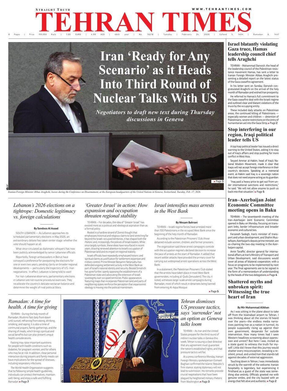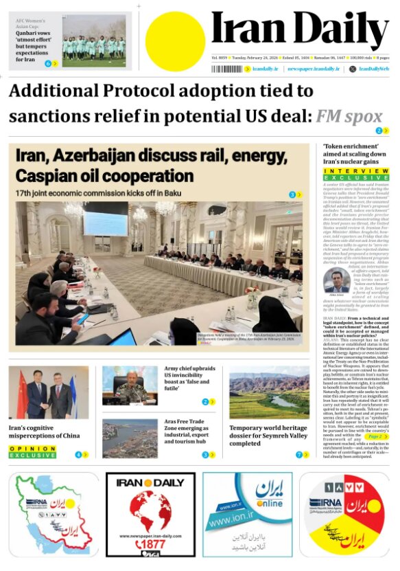 Politics 24 February 2026 - 08:01 Download photos Front pages of Iran’s English dailies on February 24 TEHRAN, Feb. 24 (MNA) – Here are the front pages of Iran's English dailies on Tuesday, February 24. Tags Iran Iran International Dailies Iranian Newspapers Related News Front pages of Iran’s English dailies on February 23 Front pages of Iran’s English dailies on February 25 Front pages of Iran’s English dailies on February 22 Front pages of Iran’s English dailies on February 26 Front pages of Iran’s English dailies on February 28