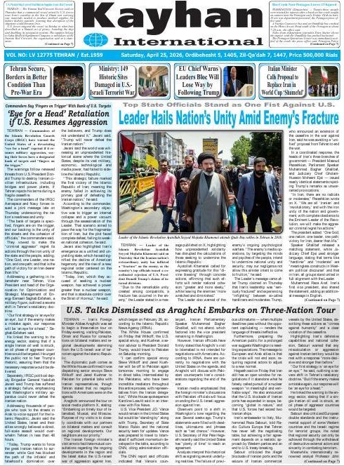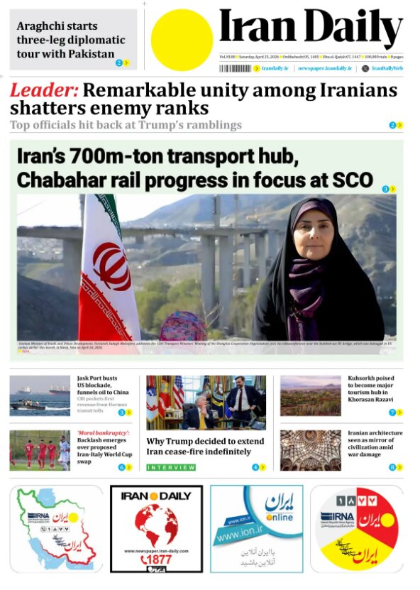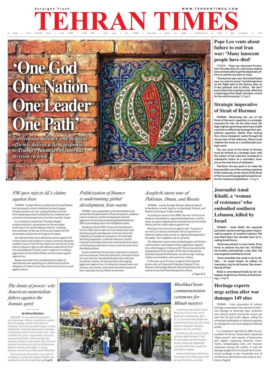 Politics 25 April 2026 - 06:35 Download photos Front pages of Iran’s English dailies on April 25 TEHRAN, Apr. 25 (MNA) – Here are the front pages of Iran’s English dailies on Saturday, April 25. Tags Iran Iran International Dailies Iranian Newspapers