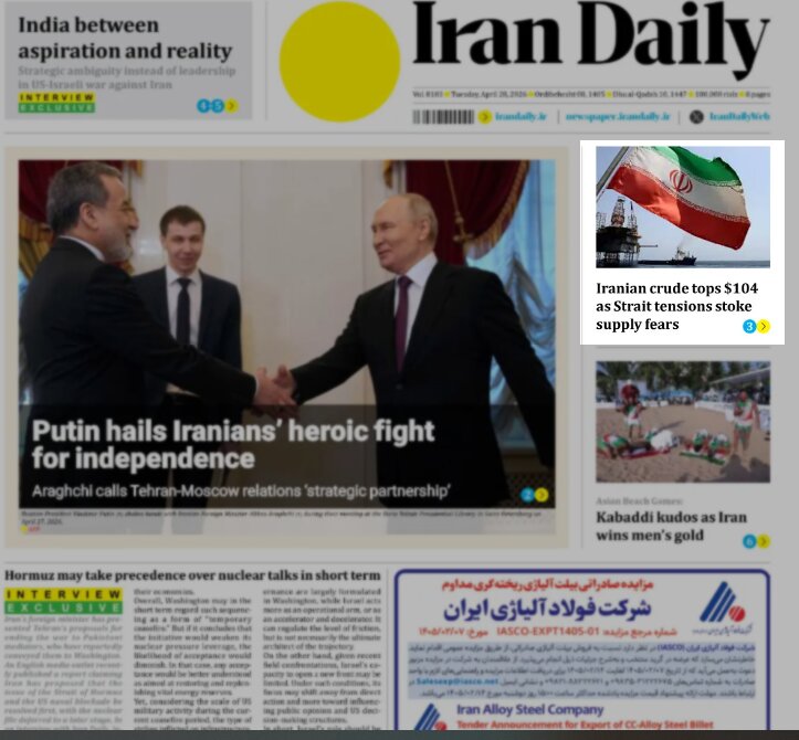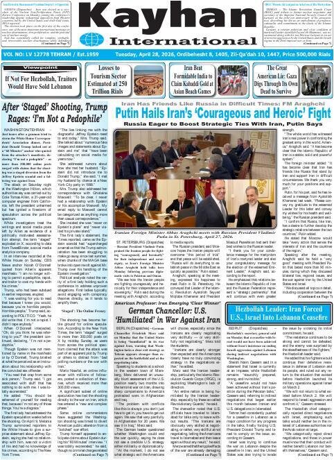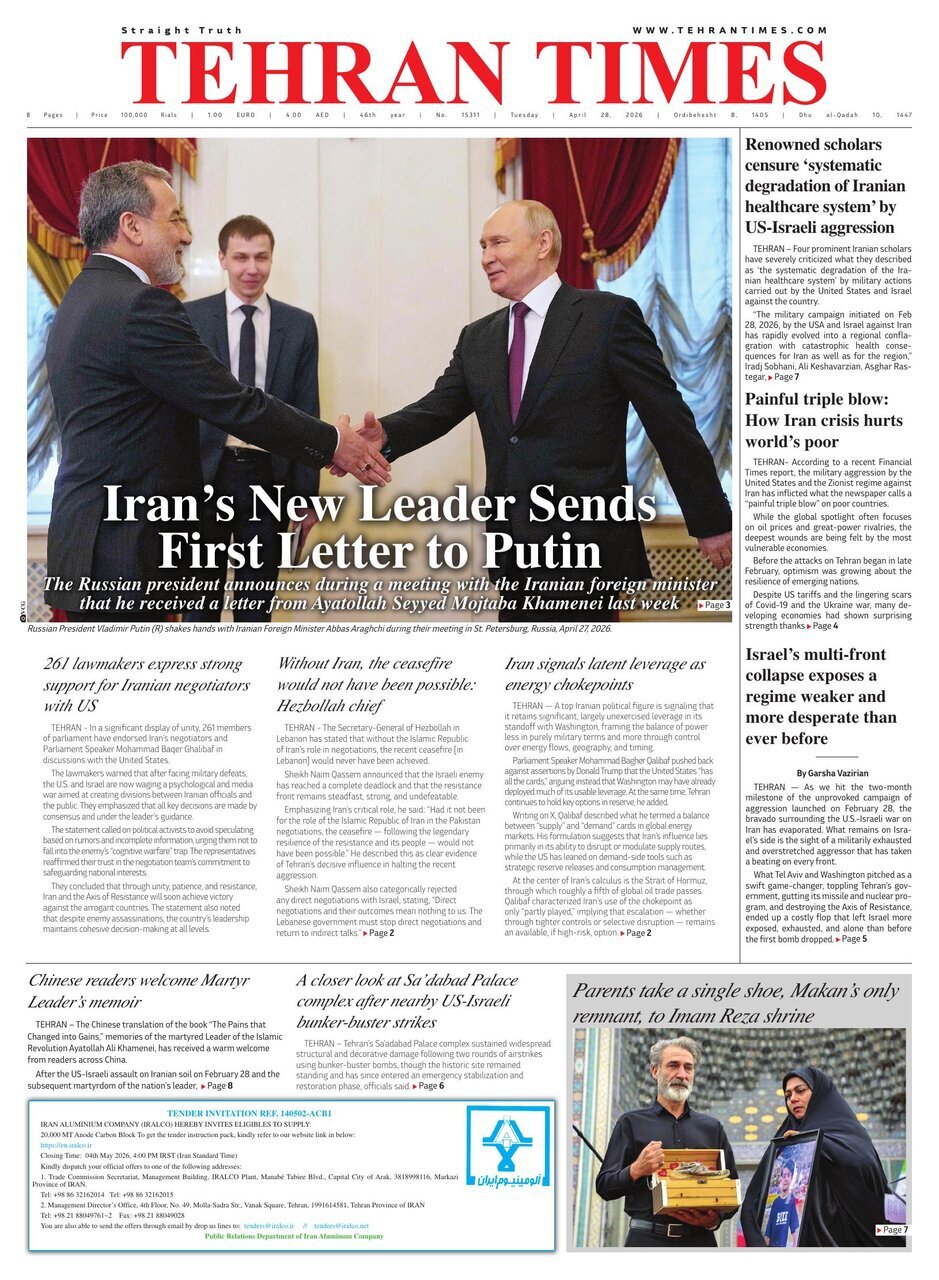 Politics Morteza Ahmadi Al Hashem 28 April 2026 - 11:07 Download photos Front pages of Iran’s English dailies on April 28 TEHRAN, Apr. 28 (MNA) – Here are the front pages of Iran’s English dailies on Tuesday, April 28. Tags Iran International Dailies Iranian Newspapers Front Page Tehran Tehran Times News Daily Related News Front pages of Iran’s English dailies on April 27 Front pages of Iran’s English dailies on April 26 Front pages of Iran’s English dailies on April 25 Front pages of Iran’s English dailies on April 23 Front pages of Iran’s English dailies on April 22